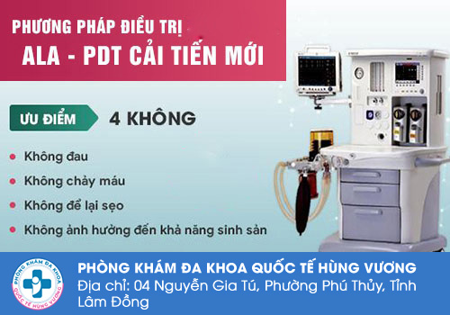 Đây là phương pháp chữa bệnh sùi mào gà hiệu quả và tiên tiến hiện nay nhận được sự đánh giá cao bởi các chuyên gia có kinh nghiệm lâu . Phương pháp ALA – PDT là sự kết hợp giữa chất gây cảm quang cùng tia quang học để kích hoạt mạch máu nuôi dưỡng các nốt sùi, tiêu diệt các loại vi khuẩn, virus gây bệnh và cắt bỏ nốt sùi triệt để, ngăn ngừa khả năng bệnh tái lặp lại.