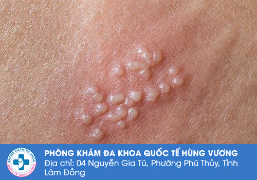 Mụn dạng nước hoặc mụn mủ, li ti, đau rát khi chạm vào, dễ vỡ gây viêm loét, chảy dịch.