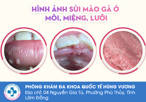 Sùi mào gà ở môi, miệng, lưỡi: Khi mắc sùi mào gà, ở miệng, lưỡi, họng sẽ nổi những hạt màu hồng hoặc đỏ, bề mặt xuất hiện các nốt sùi nên mỗi lần ăn uống thường cảm thấy vướng víu, đau đớn, khó chịu.
